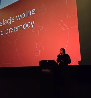 W sali kinowej Multikina przy al. Zwycięstwa 14 policjanci prowadzili wykład dla uczniów szkół podstawowych i średnich. Na widowni były dyskusje o przemocy, odpowiedzialności i zagrożeniach w sieci oraz informacje o dostępnym wsparciu.