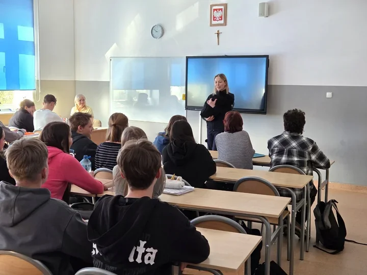 W miniony czwartek funkcjonariuszka omówiła z uczniami klasy VIII, jak rozpoznawać próby manipulacji i jak reagować, gdy rozmowa w sieci zaczyna robić się niebezpieczna. Młodzież usłyszała też, że odpowiedzialność za to, co trafia do internetu, nie znika wraz z poczuciem anonimowości.