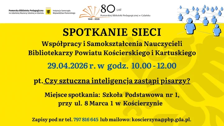 29 kwietnia 2026 roku nauczyciele bibliotekarze spotkają się o godz. 10.00 w Szkole Podstawowej nr 1 w Kościerzynie przy ul. 8 Marca 1. Całość potrwa do godz. 12.00. W centrum rozmowy stanie sztuczna inteligencja i jej miejsce w świecie czytelnictwa oraz twórczości - od pracy bibliotekarza po spojrzenie na to, jak zmienia się sposób pisania i odbierania literatury.
