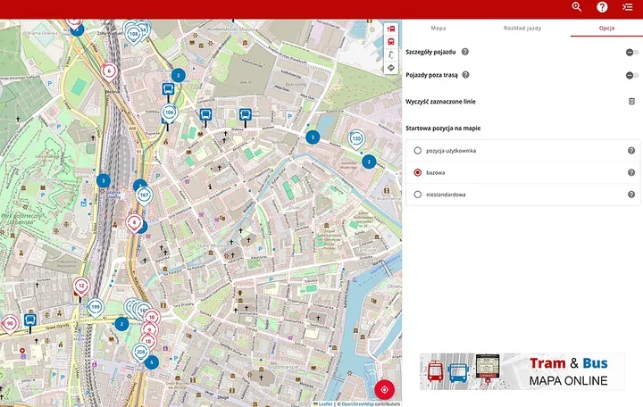 - Pozycja bazowa – domyślnie ustawiony Dworzec Główny, czyli punkt, który ZTM traktuje jako centrum startowe,
